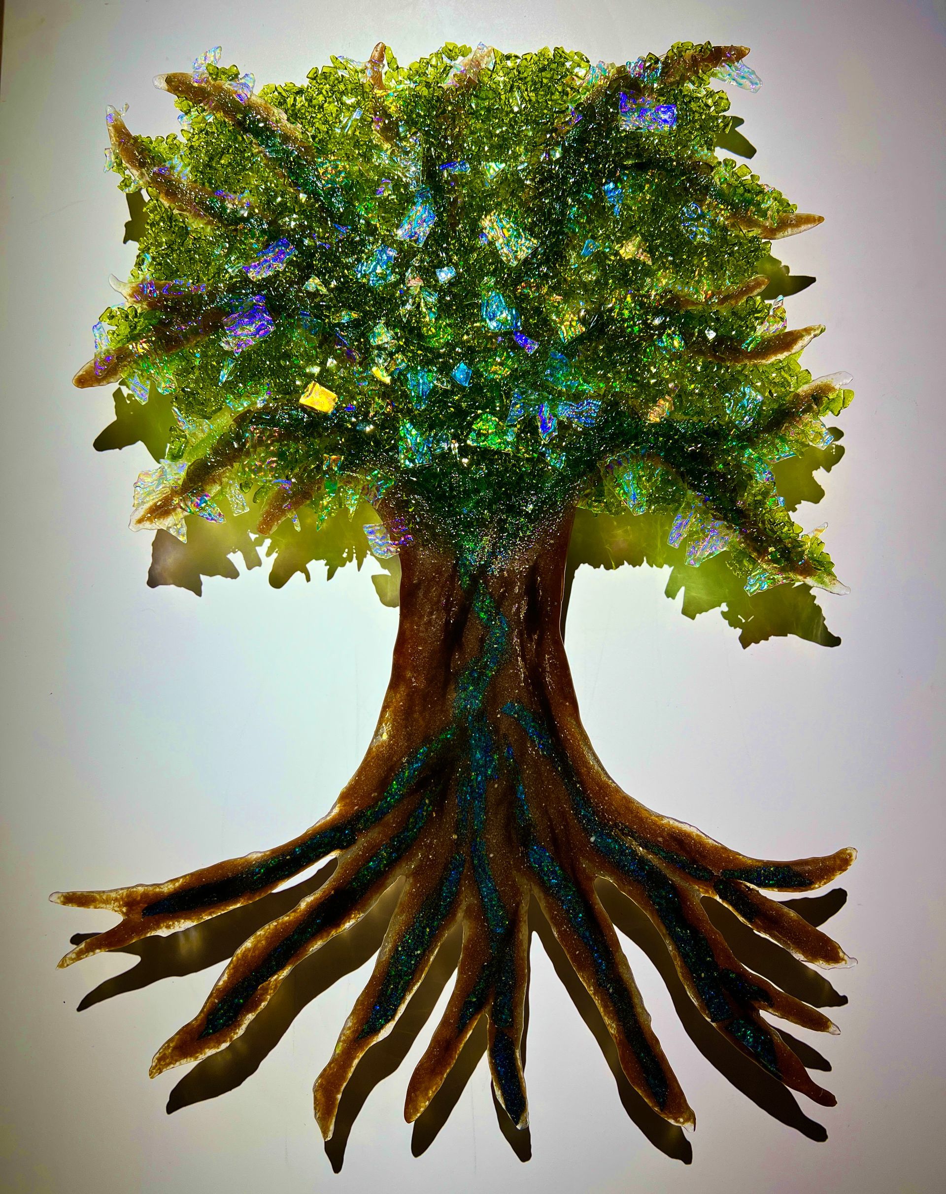 Part of the Glass Forest series, the Trees of Life use green glass fused with dichroic glass to create a unique dance between light and color within the leaves. Leaving the viewer with a sense wonder and appreciation for the beautiful side of life.