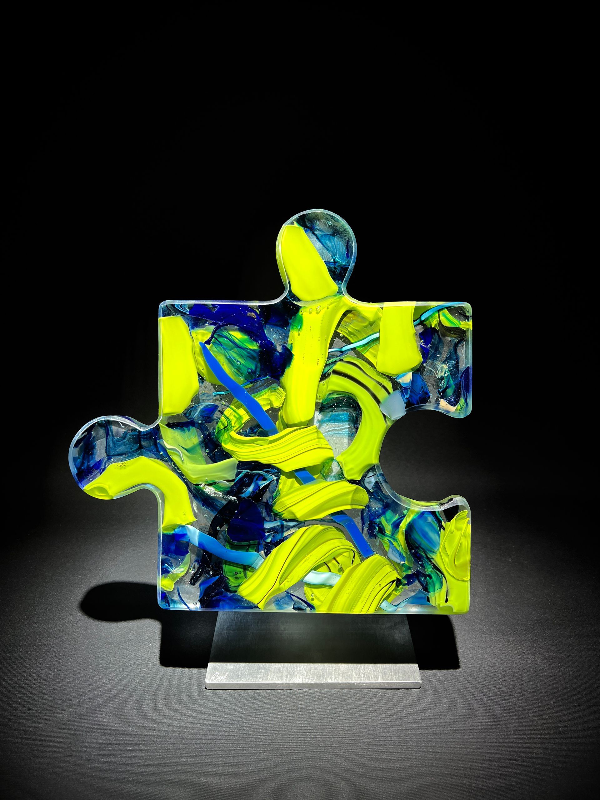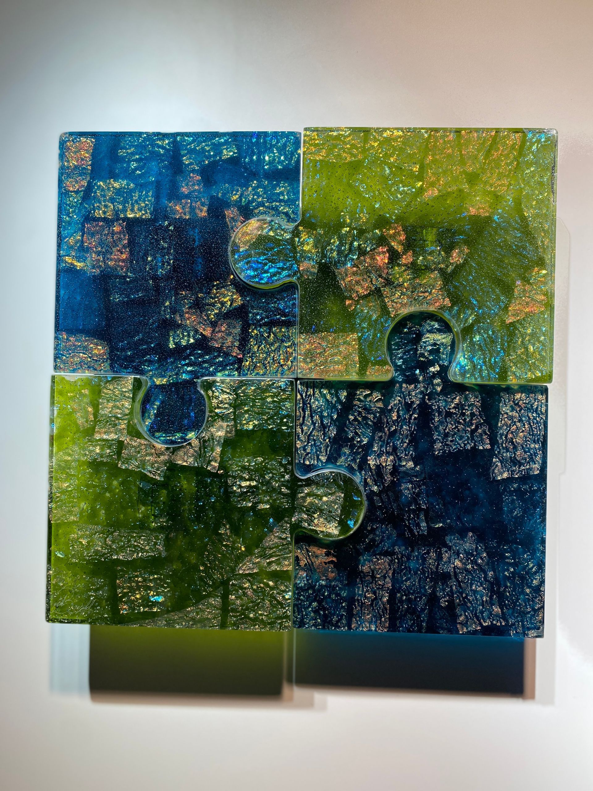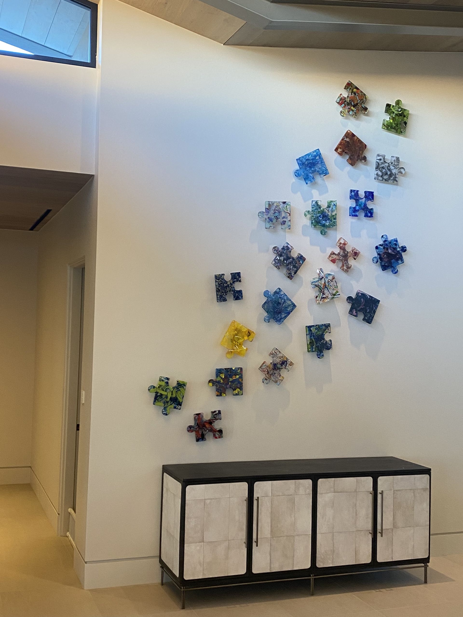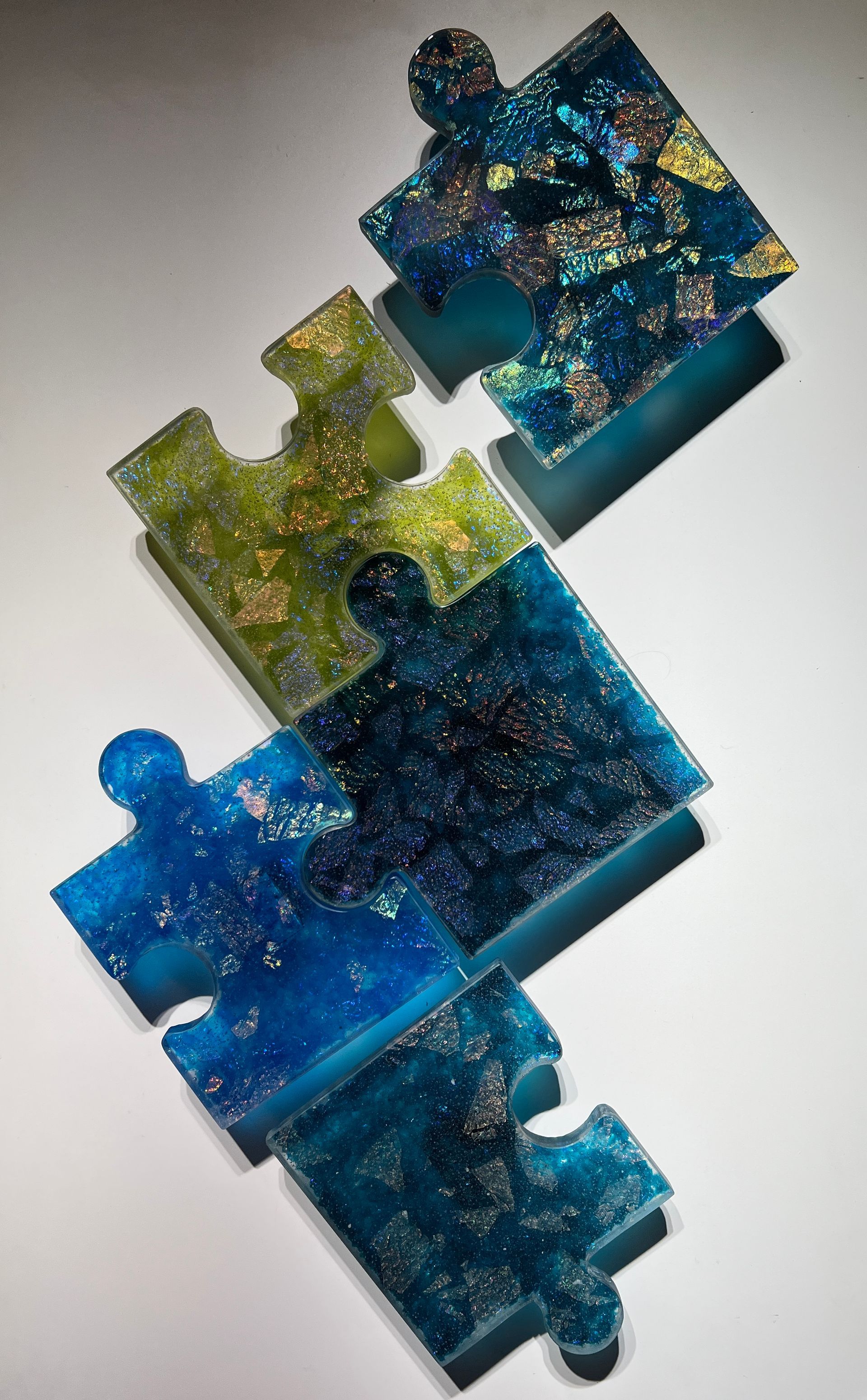 The Puzzlers are cast glass puzzle pieces that come in a variety of colors and patterns. Each piece is shaped by hand and can be connected together or displayed separately. Using custom hardware, the Puzzlers are able to be mounted on the wall or attached to a stand to be displayed on a table.