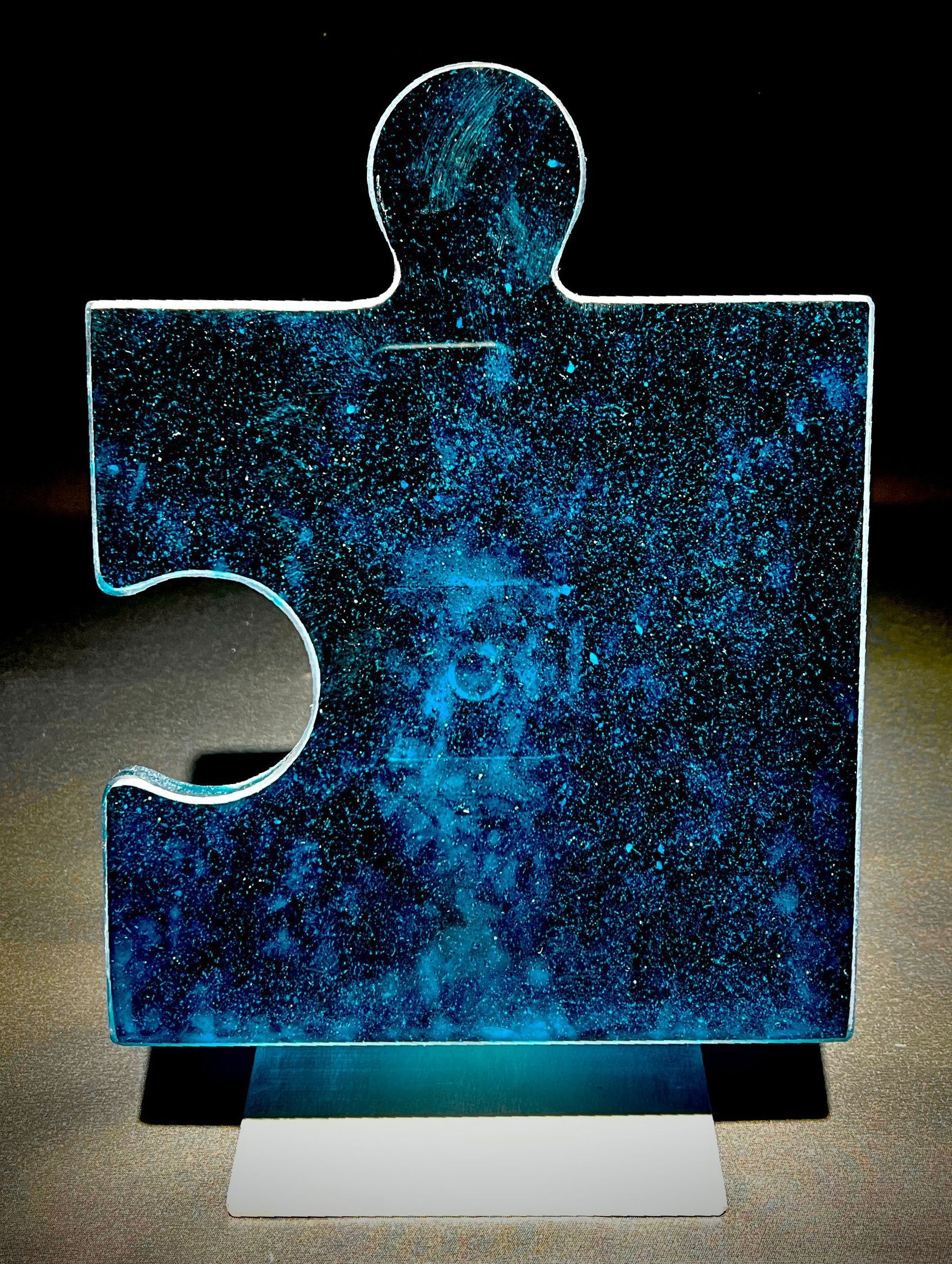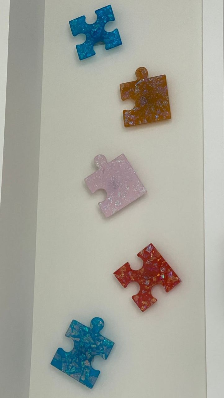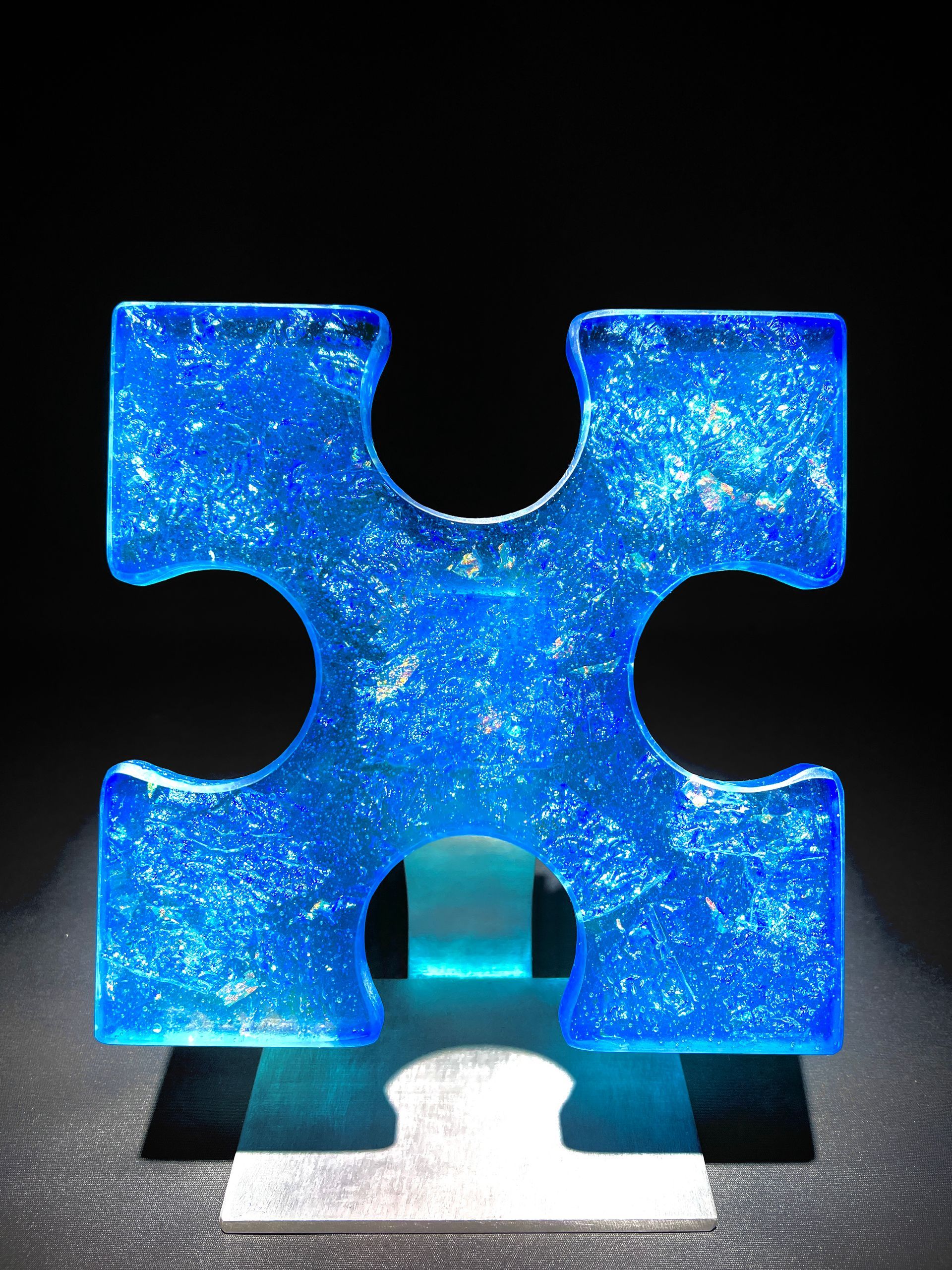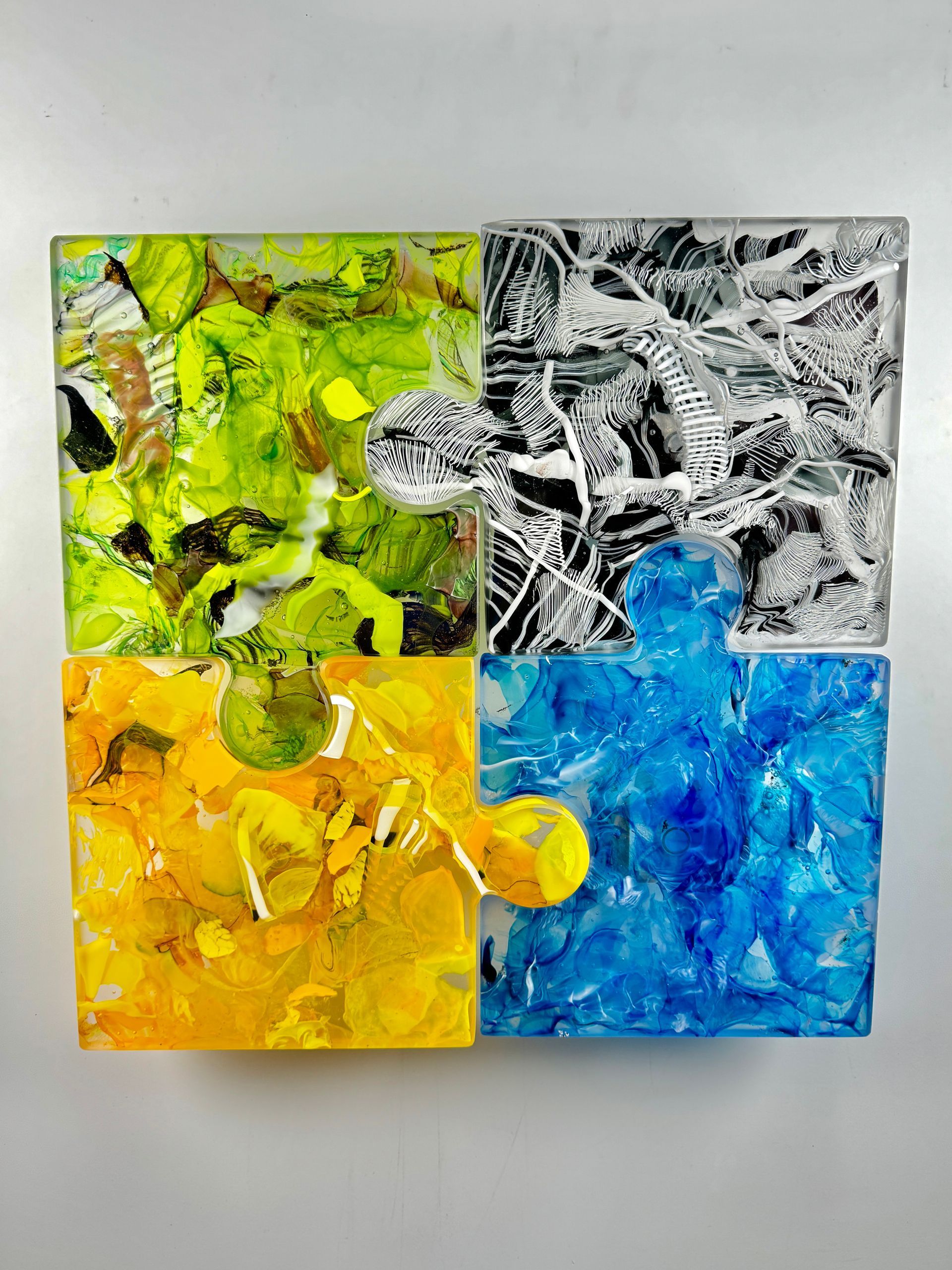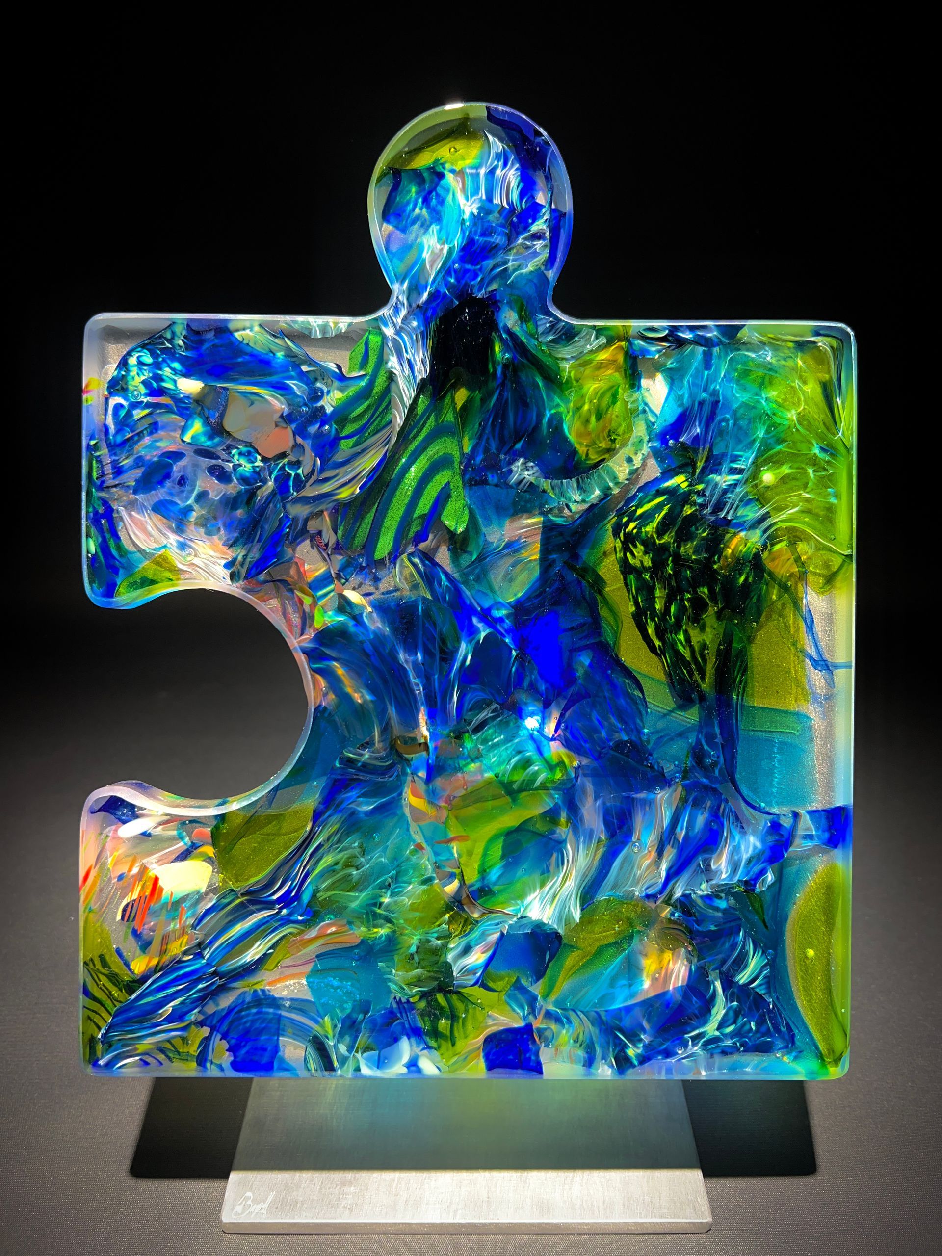 The Puzzlers are cast glass puzzle pieces that come in a variety of colors and patterns. Each piece is shaped by hand and can be connected together or displayed separately. Using custom hardware, the Puzzlers are able to be mounted on the wall or attached to a stand to be displayed on a table.