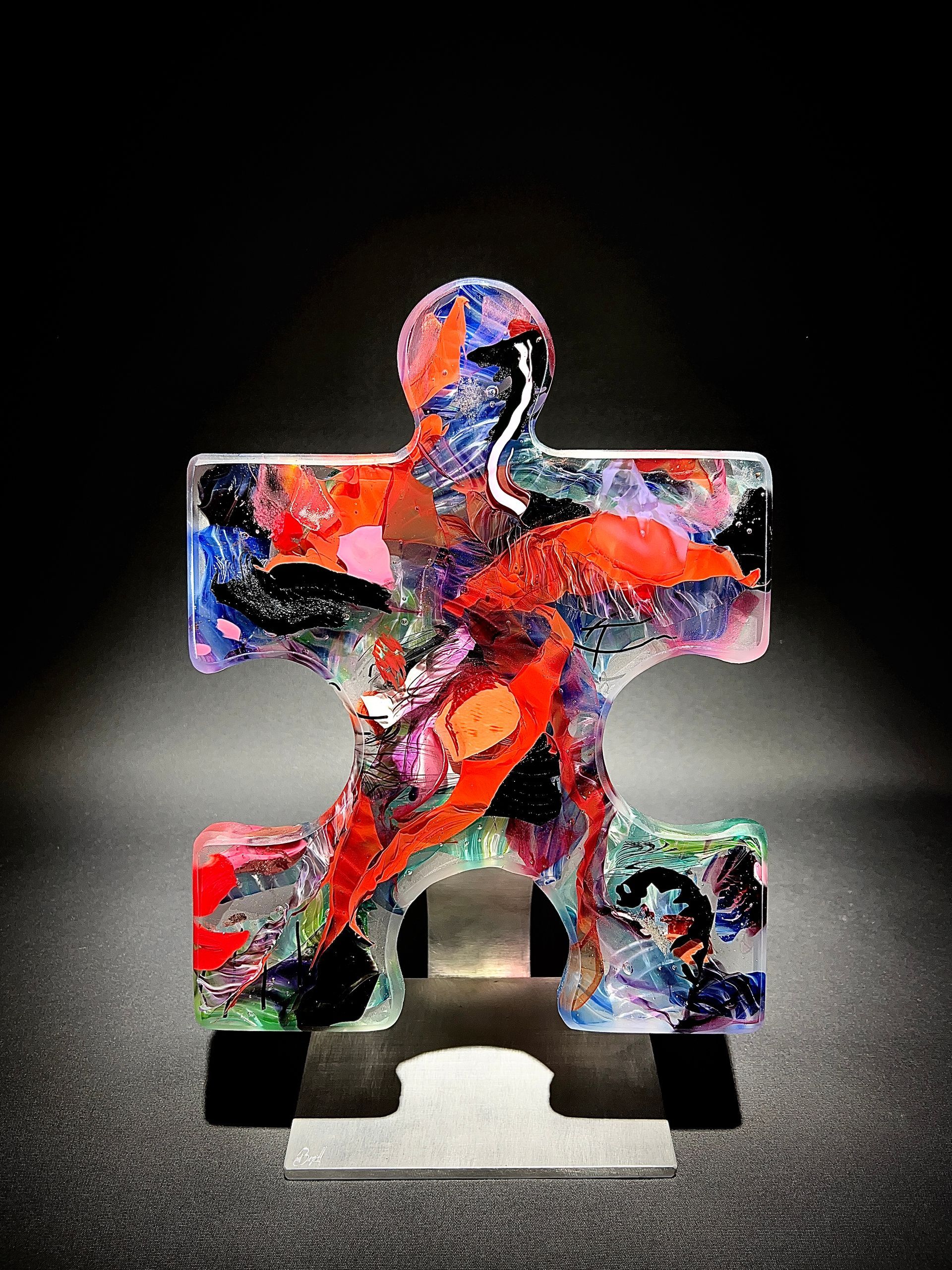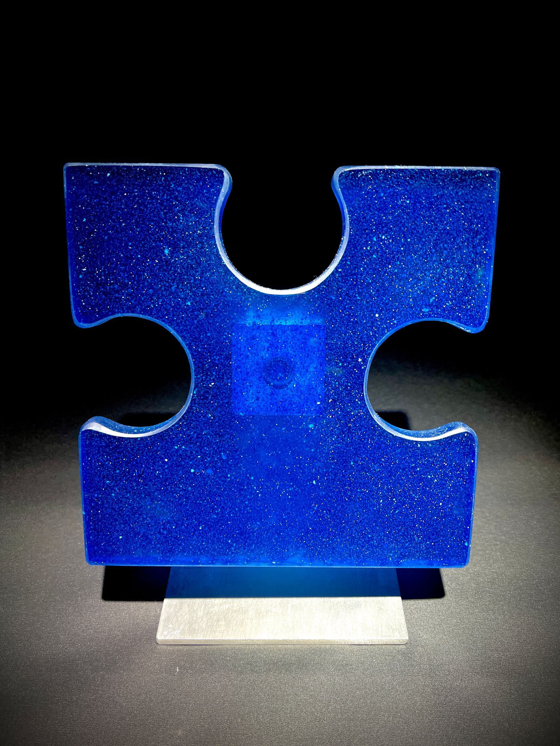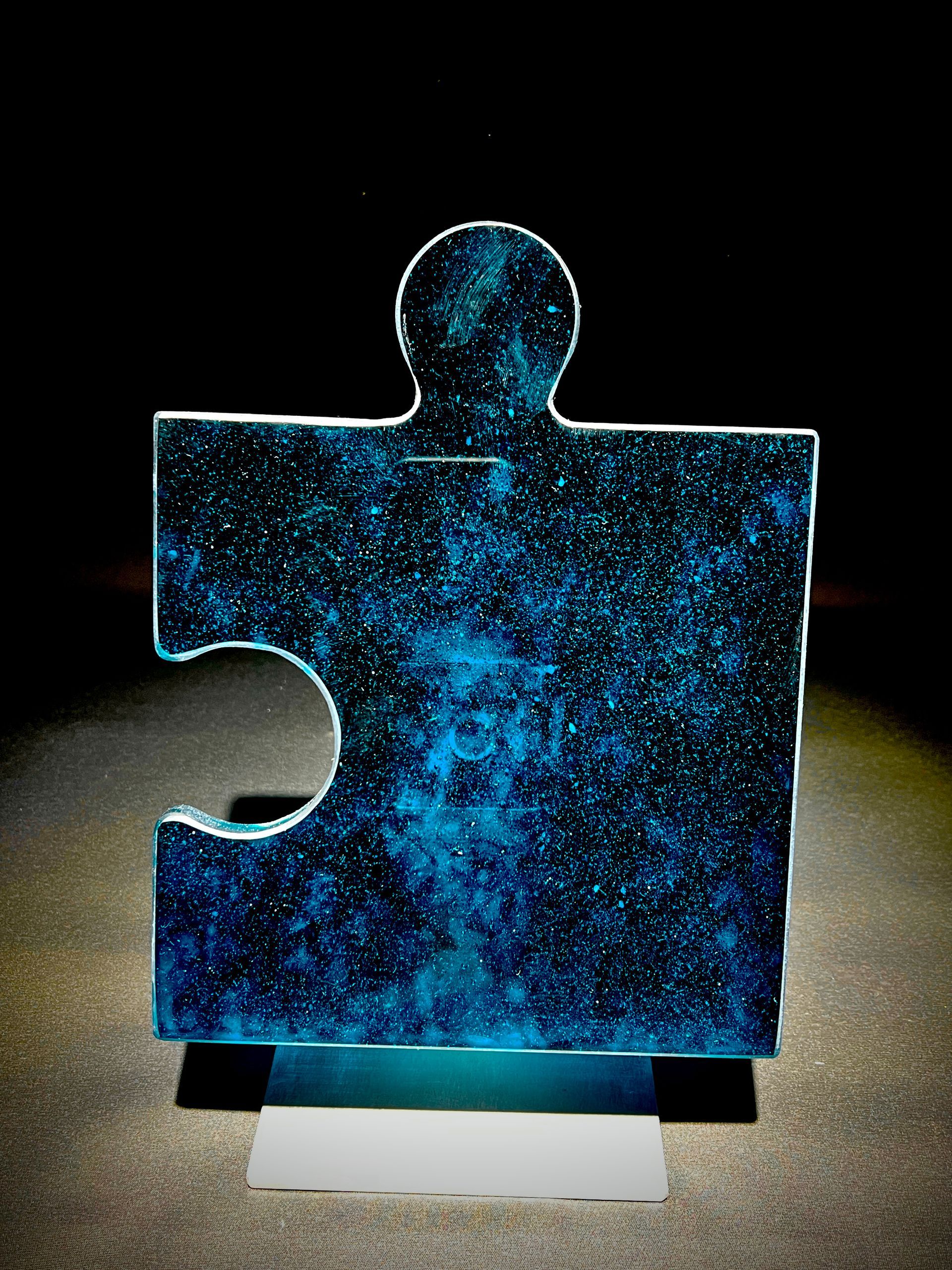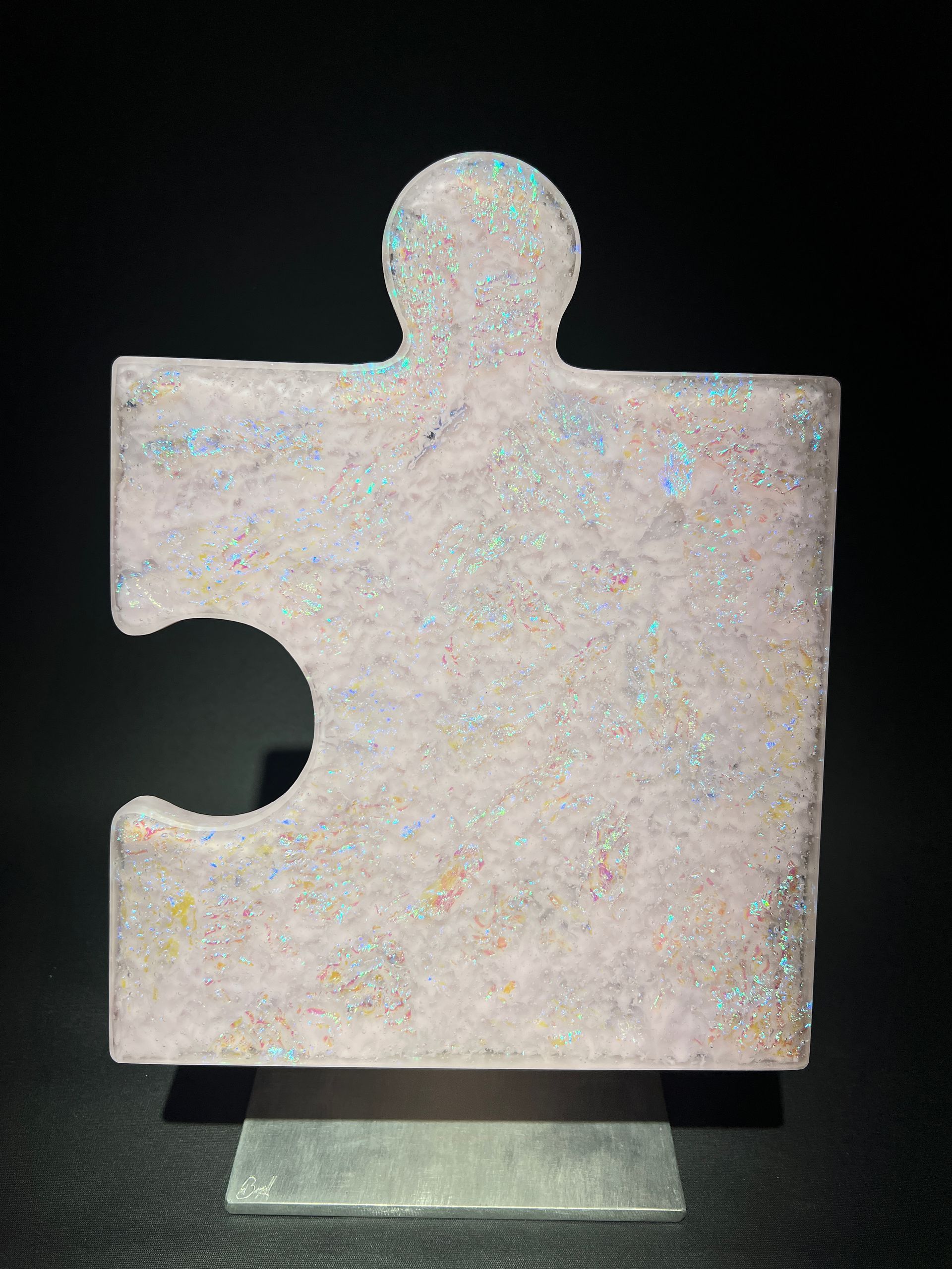 The Puzzlers are cast glass puzzle pieces that come in a variety of colors and patterns. Each piece is shaped by hand and can be connected together or displayed separately. Using custom hardware, the Puzzlers are able to be mounted on the wall or attached to a stand to be displayed on a table.