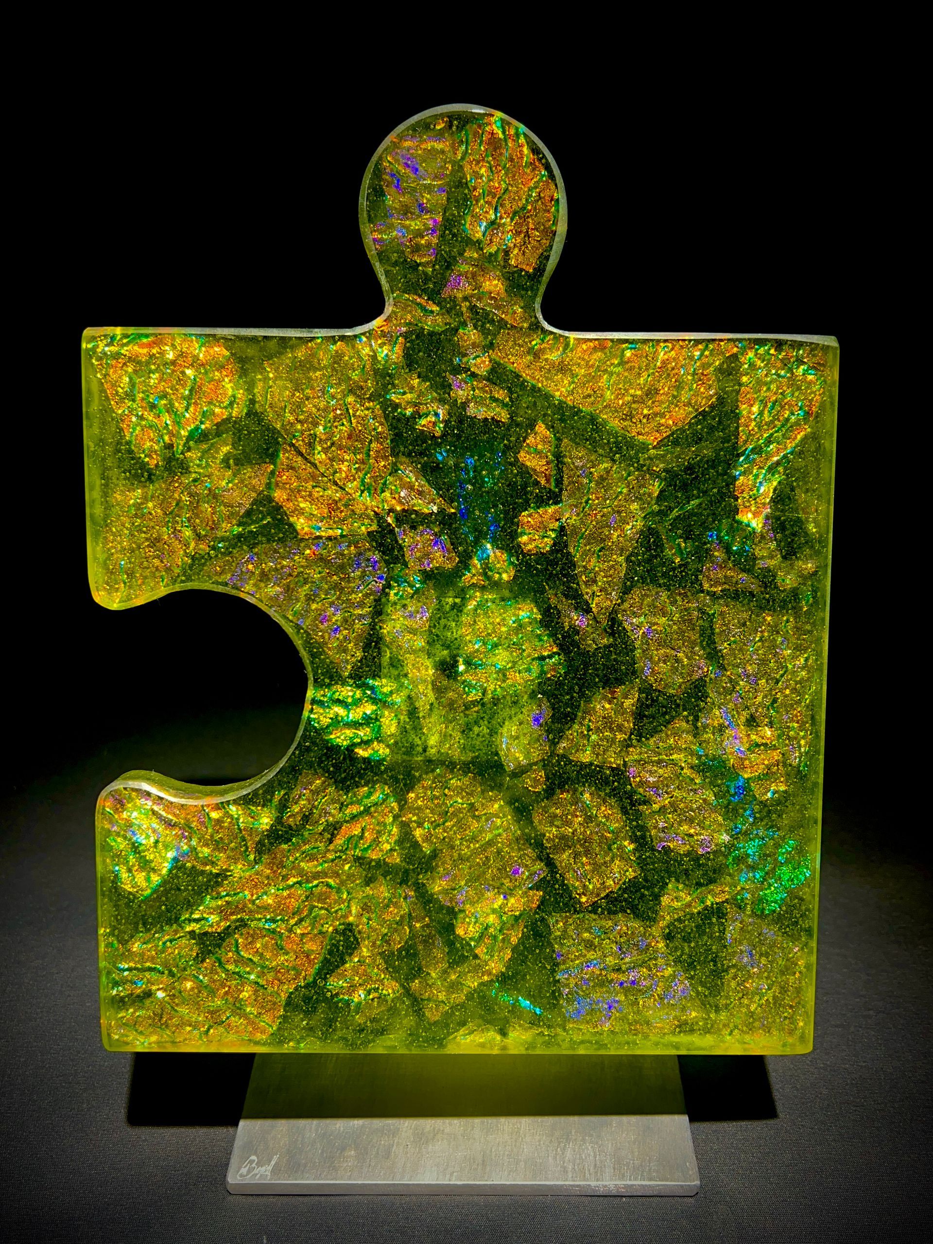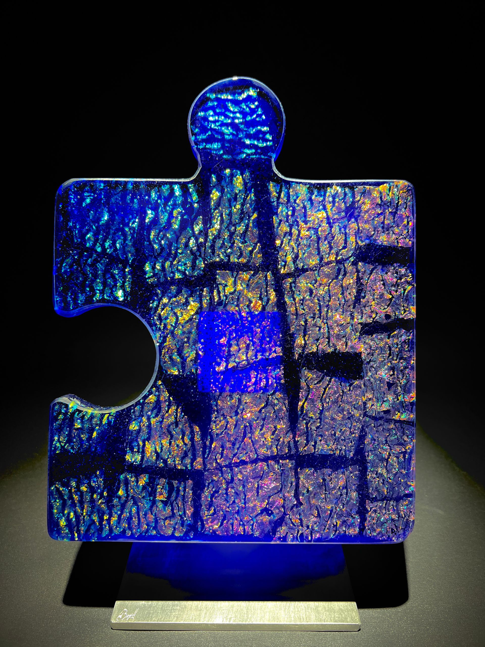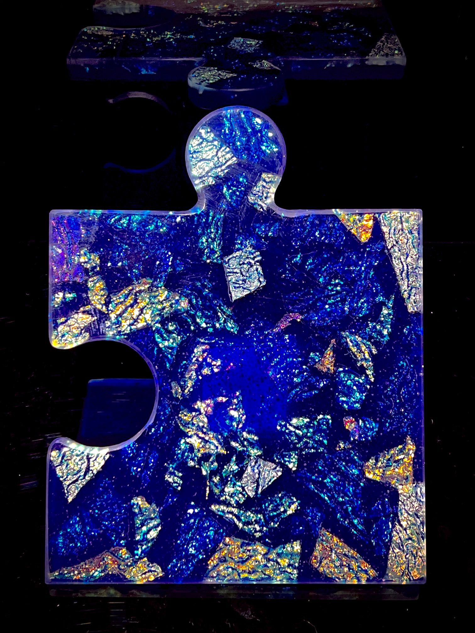 These Puzzlers use dichroic glass to create a color-changing effect within the glass.