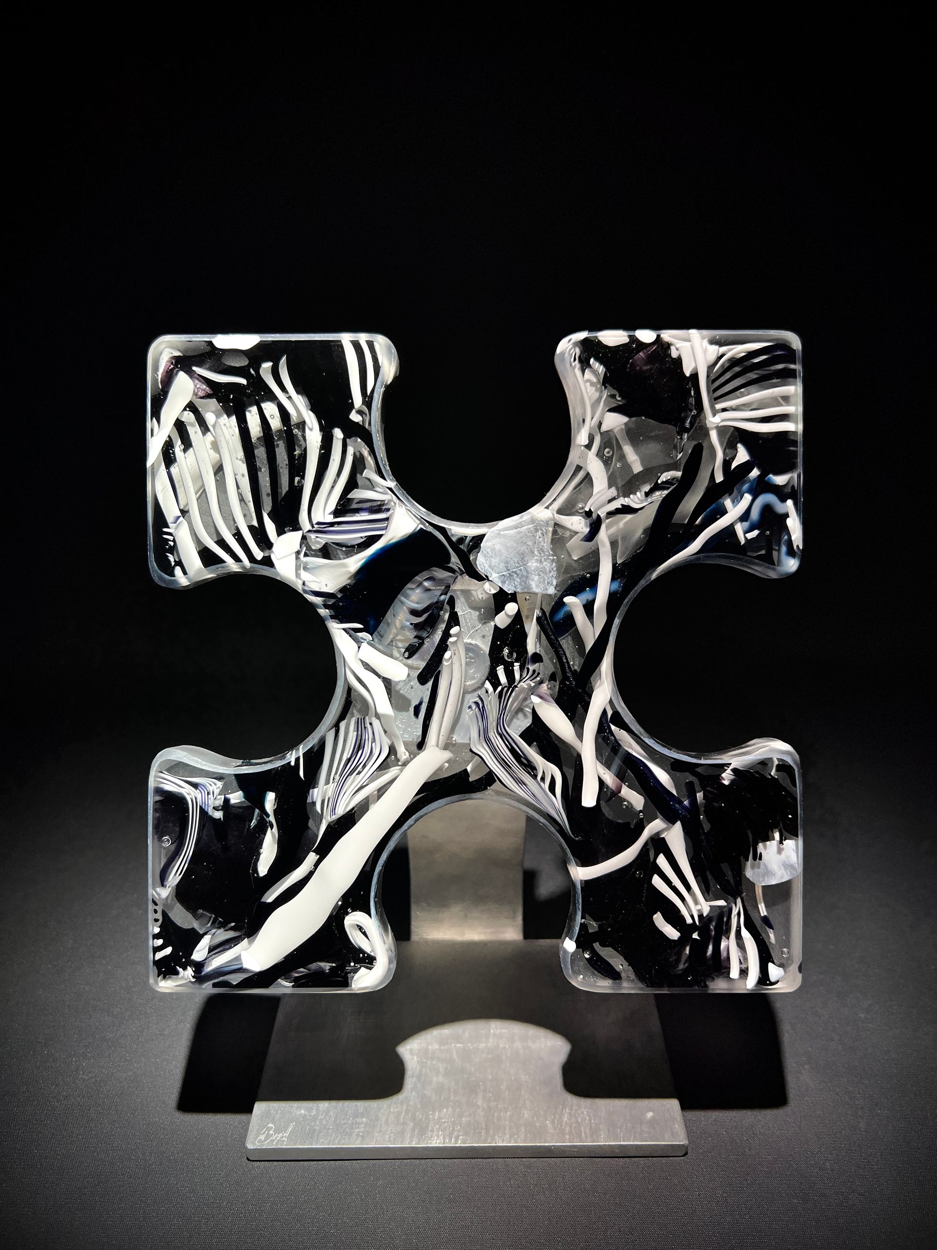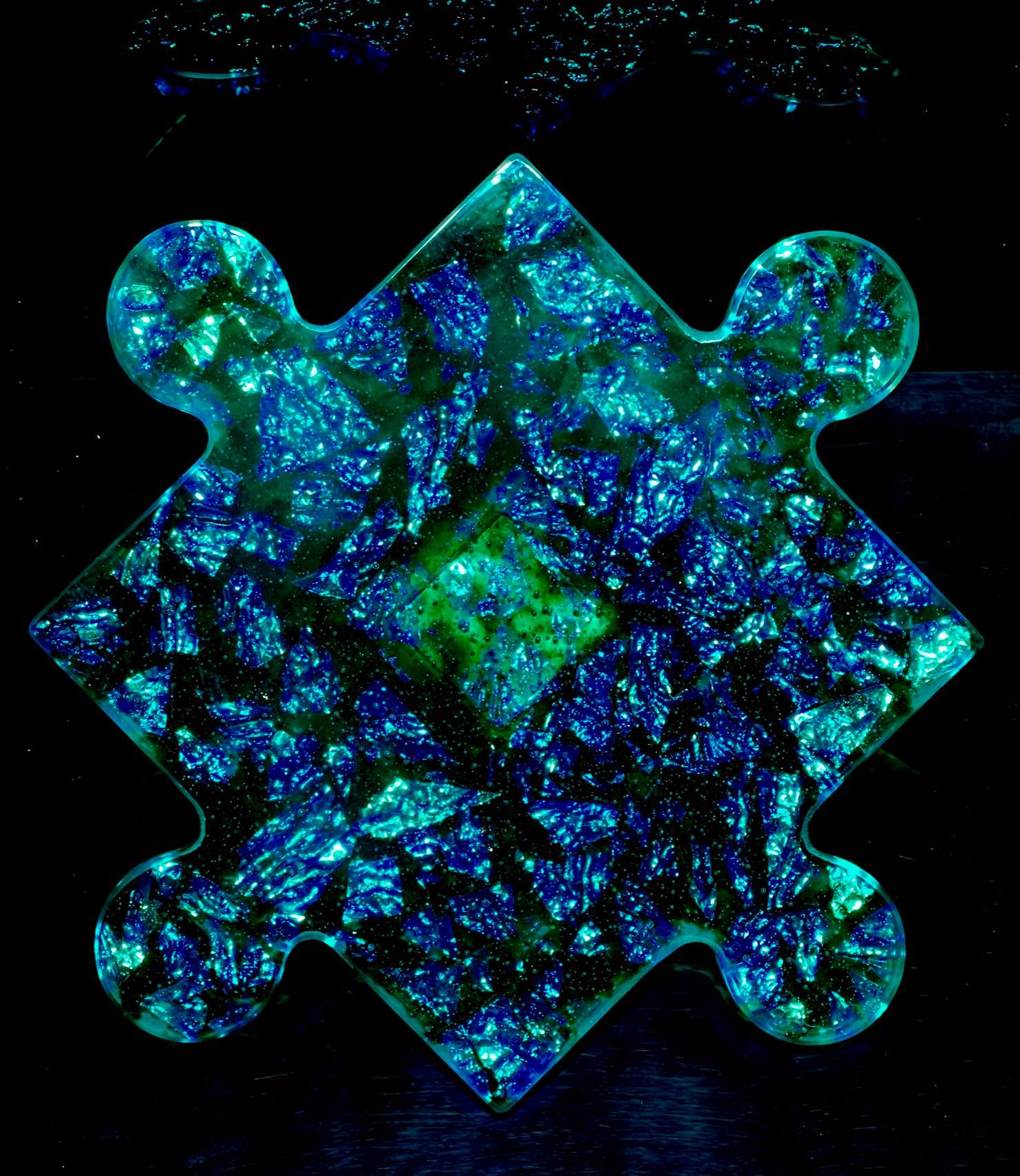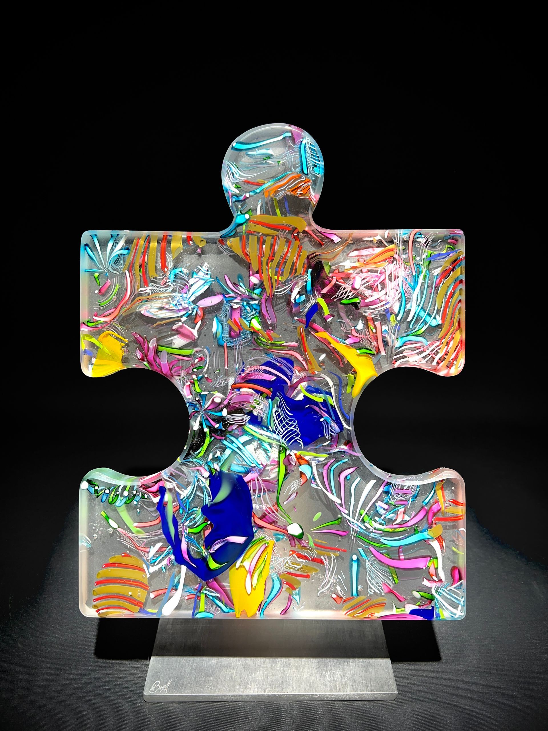 These Puzzlers use dichroic glass to create a color-changing effect within the glass.